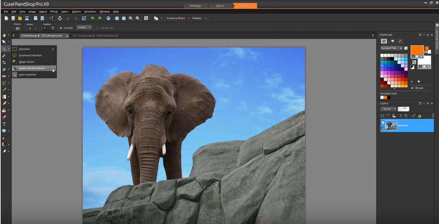 Akıllı seçim aracı benzer renk ve özellikteki alanları seçmek için kullanabileceğiniz bir araç. Bir fırça efekti şeklinde çalışan bu araçta, benzer renkteki öğeleri seçmek oldukça kolay. Aşağıdaki örnekte de görebileceğiniz gibi bu özelliği kullanırken, filin tamamını boyamak zorunda değilsiniz. Smart Selection aracı seçiliyken, filin üzerinde geçmek, aşağıdaki görselde de görebileceğiniz gibi seçimi hızlı bir şekilde yapacaktır.